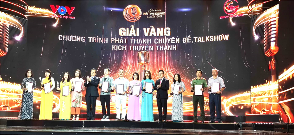 Đại diện các đơn vị nhận thưởng Giải Vàng với hạng mục tác phẩm kịch truyền thanh dự thi tại Liên hoan phát thanh toàn quốc lần thứ XV năm 2022 mới đây tại TP Hồ Chí Minh