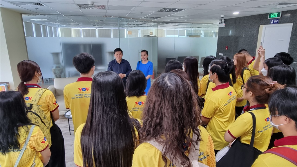 Cô Nguyễn Thị Mai Thu – Phó Trưởng khoa Báo chí và Truyền thông đưa sinh viên tham quan Trụ sở Kênh VOV Giao thông TP HCM