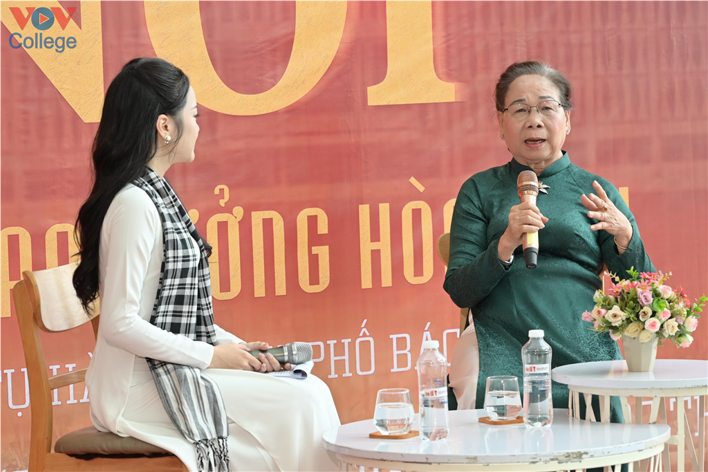 MC Ngọc Linh (trái) giao lưu cùng bà Vũ Minh Nghĩa – nữ chiến sĩ Biệt động Sài Gòn, tại buổi tọa đàm trong khuôn khổ Triển lãm "NỐI”
